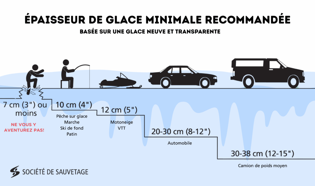 Chaque année, environ 7 Québécois perdent la vie par noyade pendant l’hiver. Dans la majorité des cas, les décès se produisent en marchant, en jouant au hockey, en pêchant ou en faisant de la motoneige sur la glace d’un cours d’eau. Pour que ce nombre de noyades diminue, voici trois consignes de sécurité à suivre avant de pratiquer une activité sur un cours d’eau gelé afin de savoir si celui-ci est suffisamment sécuritaire.