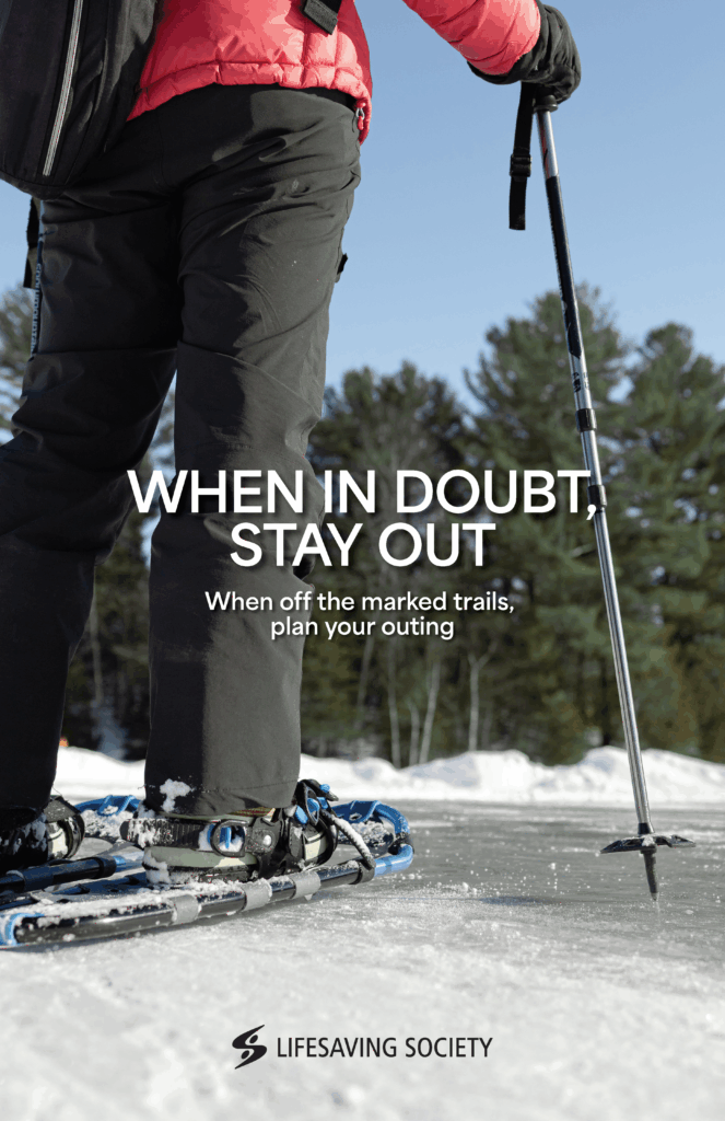 Outside marked trails, stay on solid ground : Cutting across a lake might seem like a shortcut, but it can be deadly. Many clubs across Québec maintain trails for their members. When a trail crosses a body of water and is open, it means the ice thickness has been checked and deemed safe.