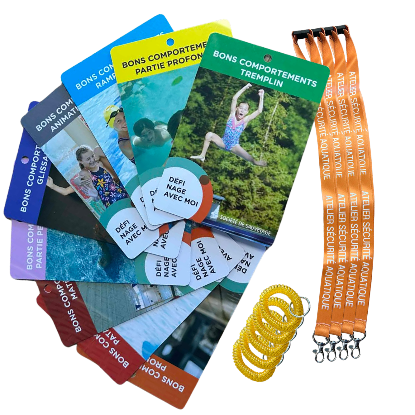 Les cocardes sont destinées aux accompagnateurs de groupes en milieu aquatique. Elles rappellent les comportements sécuritaires à transmettre aux enfants. Les bracelets et les lanières servent à fixer les cocardes